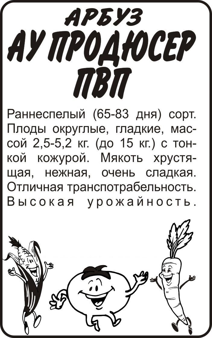 Сверхранний (65 дней) сорт. Плоды массой до 15 кг, с тонкой кожурой. Мякоть хрустящая, очень сладкая. Отличная транспортабельность. Высокая урожайность. Хорошо растёт на песчаных и супесчаных почвах. Избыточно влажные почвы не пригодны. Участок должен быть хорошо про-греваемым и освещённым, защищённым от ветров.