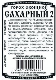 Среднеранний (70-75 дней) сахарный сорт. Стебель высотой 70 см. На одном растении образуется до 14 темно-зеленых стручков, без пергаментного слоя, длиной 5-8 см.