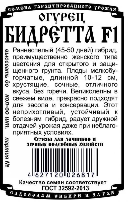 Раннеспелый (45-50 дней) гибрид, преимущественно женского типа цветения для открытого и защищенного грунта. Плоды мелкобугорчатые, 10-12 см, хрустящие, сочные, отличного вкуса, без горечи. Великолепны в свежем виде, прекрасно подходят для засола и консервации. Этот неприхотливый, устойчивый к болезням гибрид, радует дружной отдачей урожая всегда даже при неблагоприятных условиях.