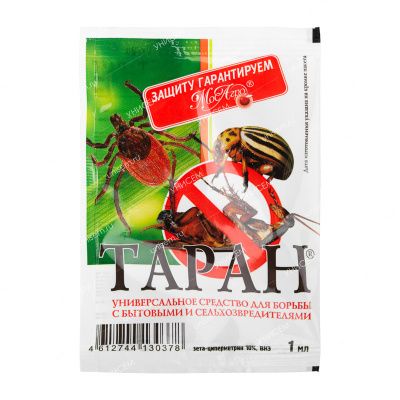 Таран – универсальное инсектоакарицидное средство-концентрат для борьбы с бытовыми и сельхозвредителями. Применяется для уничтожения тараканов, клопов, муравьев (рыжих домовых и черных садовых), мух, блох, комаров, иксодовых и других видов клещей, вредителей сельскохозяйственных культур (колорадский жук, картофельная коровка, плодожорки, листовертки, тли, белянки, моли).