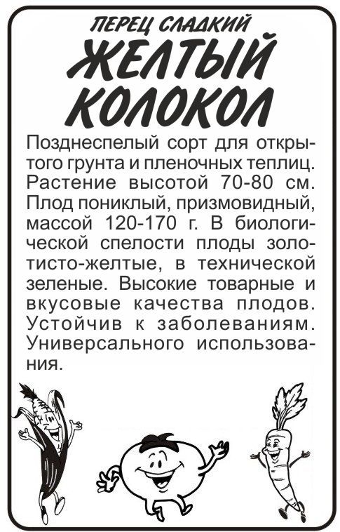 Позднеспелый сорт для открытого грунта и пленочных теплиц. Растение высотой 70-80 см. Плод пониклый, призмовидный, массой 120-170 г. В биологической спелости плоды золотисто-желтые, в технической зеленые. Высокие товарные и вкусовые качества плодов. Устойчив к заболеваниям. Универсального использования. Можно выращивать после моркови, капусты, свеклы, бобовых (кроме фасоли) и тыквенных культур. Перец нельзя размещать рядом с огурцом. Выращивается рассадным способом. Для полу-чения рассады семена высевают в феврале в посевные ящики с почвенной смесью. Ящики, накрытые пленкой (стеклом), помещают в теплое место. Оптимальная температура для прорастания семян 23-25°С. В открытый грунт высаживают в начале июня.