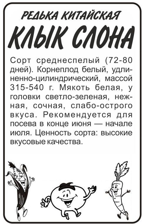 Сорт среднеспелый (72-80 дней). Корнеплод белый, удлиненно-цилиндрический, массой 315-540 г. Мякоть белая, у головки светло-зеленая, нежная, сочная, слабо-острого вкуса. Рекомендуется для посева в конце июня — начале июля. Ценность сорта: высокие вкусовые качества. Хорошие урожаи дает на глубоко обработанных плодородных супесчаных или суглинистых почвах с нейтральной и слабокислой реакцией. Можно размещать после любых овощных культур, кроме крестоцветных, на второй год после внесения навоза. Посев проводят с середины июня. Семена заделывают на глубину 1,5-3 см, в зависимости от типа почвы и времени посева. При проявлении первого настоящего листа всходы прореживают. Нельзя допускать загущенности посевов, пересыхания и уплотнения почвы, так как это может вызвать стрелкование растения. Необходим своевременный полив, особенно во время формирования корнеплодов.