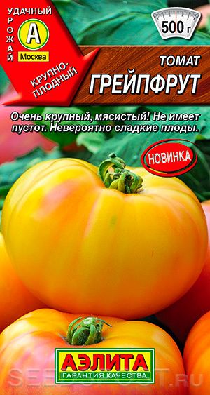 Восхитительный сорт-биколор, в котором привлекательно все: окраска, вкус и урожайность. Томат среднего срока созревания, период от всходов до созревания 110-115 дней. Растение индетерминантное, мощное, высотой 2,0-2,5 м. Плоды* невероятно красивые (массой 300-500 г), жёлтого цвета с малиновыми румянами, мякоть желто-розовая. Сорт Грейпфрут отличается превосходным вкусом, благодаря оптимальному сочетанию сахаров и кислоты. Сочные и сладкие томаты отлично подходят для детского и диетического питания. Рекомендуются для употребления в свежем виде, приготовления соусов и паст. Урожайность 9-10 кг/м 2