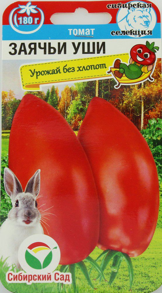 Томат Заячьи Уши АФ Сибирский Сад - сорт очень удачный, среднеранний: 100-105дней. Максимально универсальный, подходит для различных видов потребления. Даже при резкой смене температуры показывает отличную завязываемость, томат неприхотливый, вкус отменный, урожайность высокая. Подвязка при выращивании необязательна. А вот пасынкование даже противопоказано, может привести к снижению урожайности. Сорт прекрасно плодоносит и в Сибири, и на Урале, и на Дальнем Востоке, как и в остальных регионах России. Плодоношение долгое, хорошо может дозариваться, подходит для консервирования. Рассада у сорта Заячьи Уши красивая, позволяет экономно разместить до 6ти штамбовых крепких растений на одном квадратном метре. С одного квадратного метра урожайность достигает 20кг. Плоды удлинённые, перцевидные, ярко-красные, масса 180г. Мякоть вкусная, кожица нежная. Не трескаются при консервации.