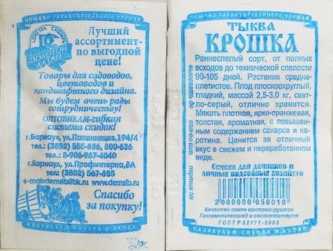 Раннеспелый сорт, от полных всходов до технической спелости 90-100 дней. Растение среднеплетистое. Плод плоско-округлый, гладкий, светло-серый, массой 2,5-3,0 кг. Мякоть плотная, ярко-оранжевая, толстая, ломкая, ароматная, с повышенным содержанием сахаров и каротина, отличного вкуса. Плоды отлично хранится.